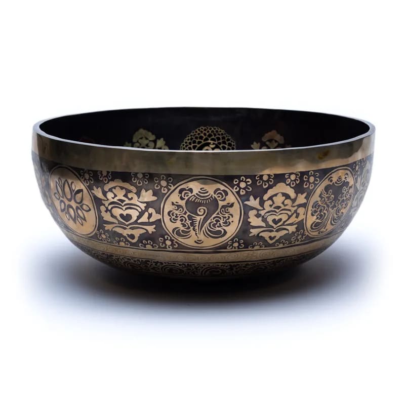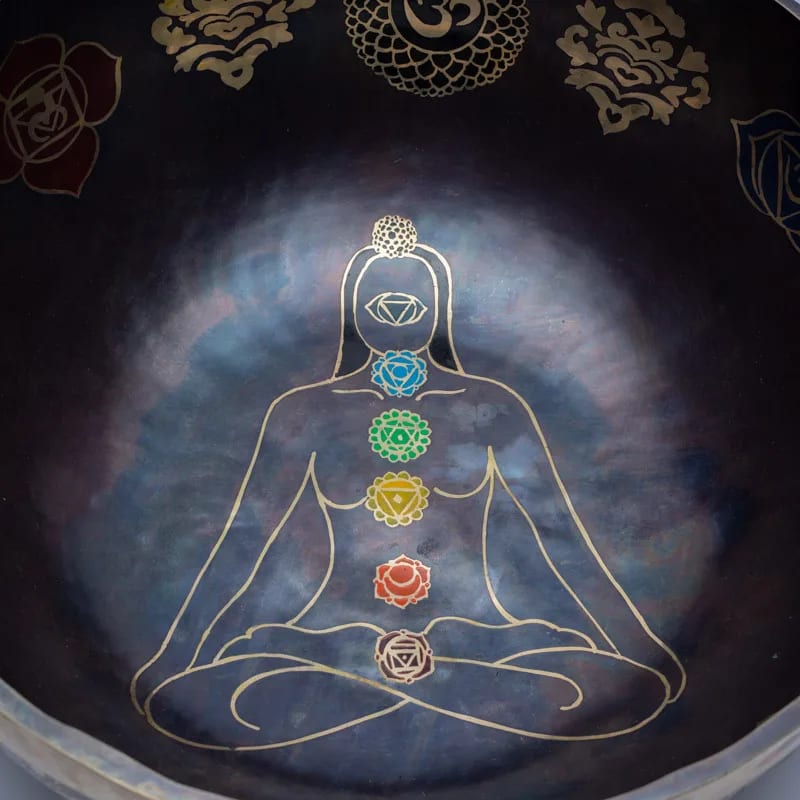 Wunderschön graviert mit dem Bild eines Yogis/ einer Yogini und den 7 Chakra-Symbolen in Farbe. Auf der Außenseite befinden sich die tibetischen Glückssymbole und das Symbol der Blume des Lebens (unten). Auch als Fußklangschale geeignet.