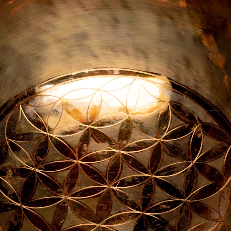 Dunklere Klangschale mit prächtigem Blume des Lebens-Symbol auf der Innenseite. Sie hat einen reinen Klang mit vielen Obertönen.