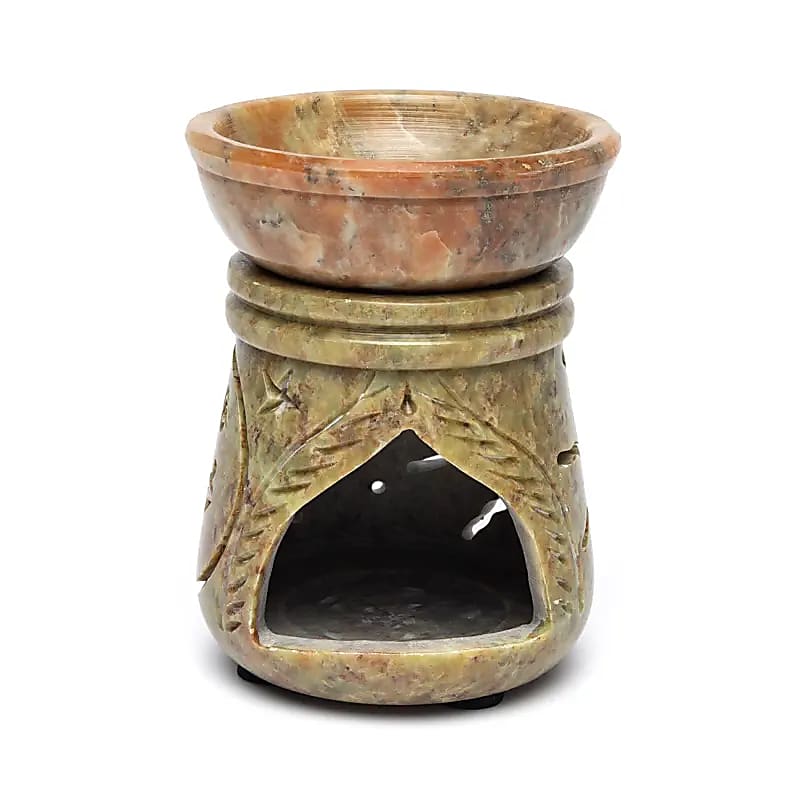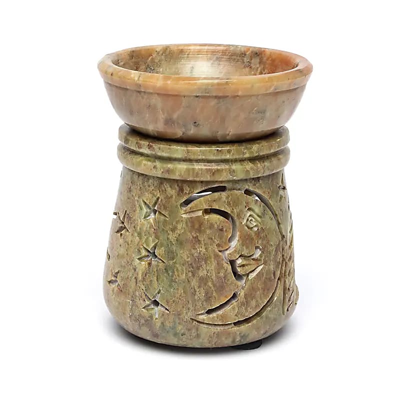 Ölbrenner aus natürlichem Speckstein mit offen gearbeitetem Sonnen- und Mondmotiv. Ein kompakter Brenner zum Verdampfen ätherischer Öle mit einem Teelicht.