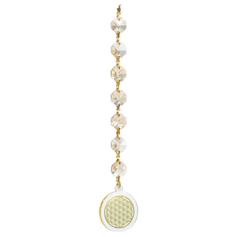 Dieser Hänger besteht aus sieben kleinen champagnerfarbigen, achteckigen Kristallen, die die sieben Chakren symbolisieren und einer in Kunstharz gegossenen Blume des Lebens. Wenn dieses Deko-Objekt in einem Fenster hängt, zaubert das Sonnenlicht magische Farben in den ganzen Raum!