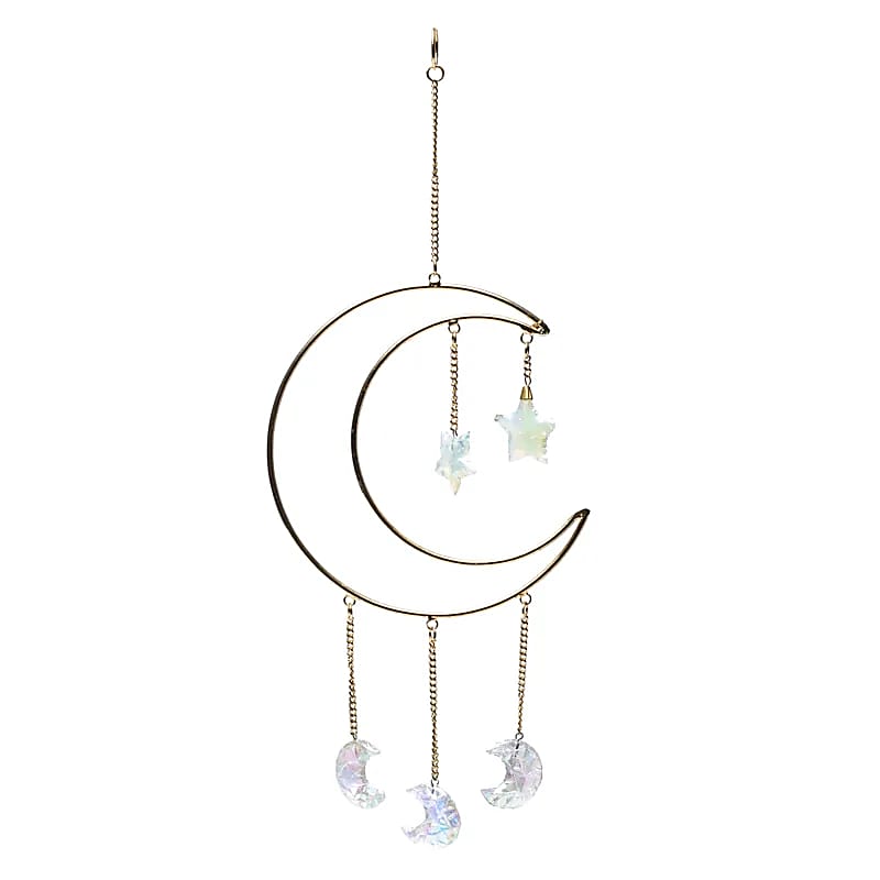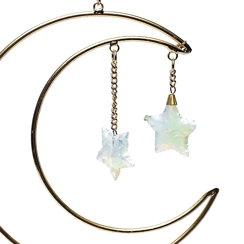 Sichelförmiger goldfarbener Fensterhänger mit mehreren opalisierenden Glasmonden und -sternen, die durch kleine Ketten verbunden sind.