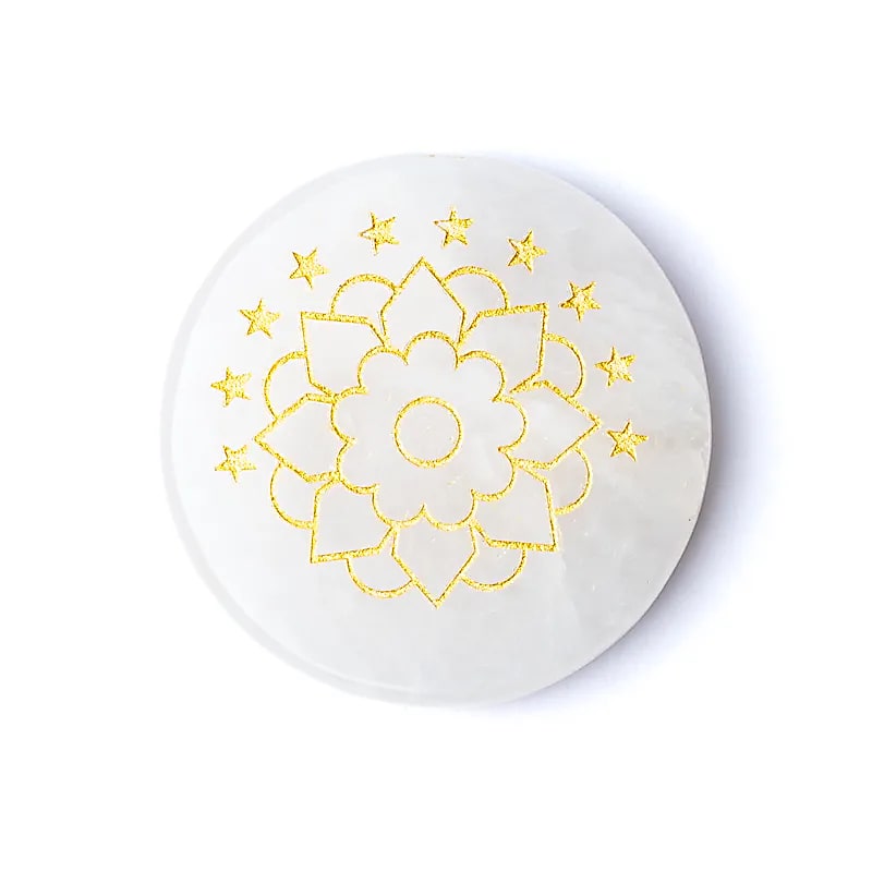 Produktinformationen "Gravierte Mineralienscheibe Bergkristall Lotus"