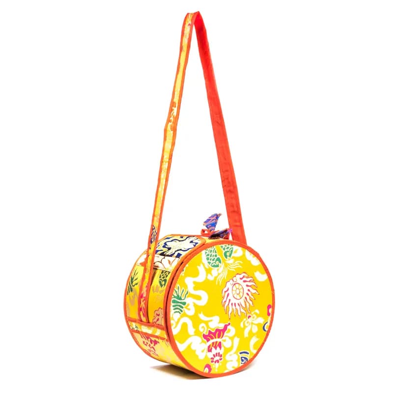 Faszinierende und mystische Chöd Trommel, wunderschön dekoriert mit einer bunten Seidenquaste und Fransen, sehr auffällig und perfekt im Klang. Einfach zusammen zu rollen und in der mitgelieferten Seidenbrokatbox ideal für unterwegs.
