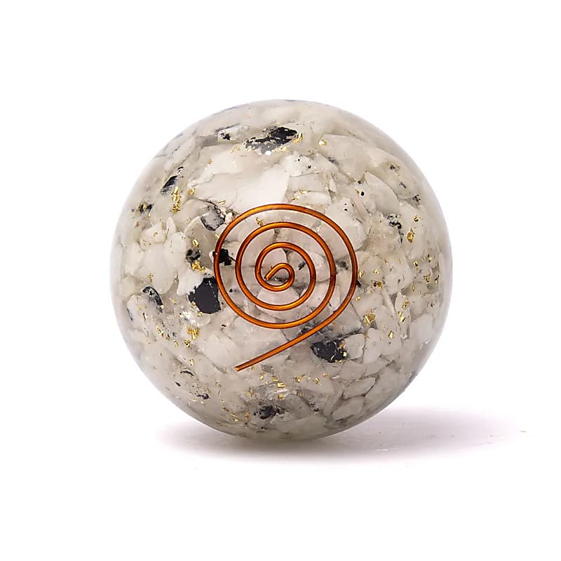 In dieser Orgonitkugel sind kleine Mondsteinsplitter in die Harzmatrix eingebettet. Mondstein wird von Kristalltherapeuten geschätzt, weil er Intuition und emotionale Harmonie fördern soll. Sein schimmernder Glanz spiegelt den Mondzyklus wider und wird häufig mit Sakral- und Stirnchakra in Verbindung gebracht, wo Instinkt und Vorstellungskraft zusammentreffen.