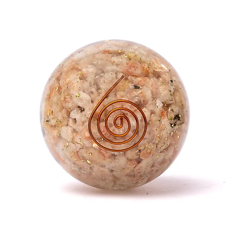 In dieser Orgonitkugel sind kleine Sonnensteinsplitter in die Harzmatrix eingebettet. Sonnenstein wird von Kristalltherapeuten wegen seiner Verbindung zu Vitalität, Selbstvertrauen und Lebensfreude geschätzt. Sein warmer Schimmer wird häufig mit dem Solarplexuschakra in Verbindung gebracht, dem Zentrum von Willenskraft und persönlicher Energie.