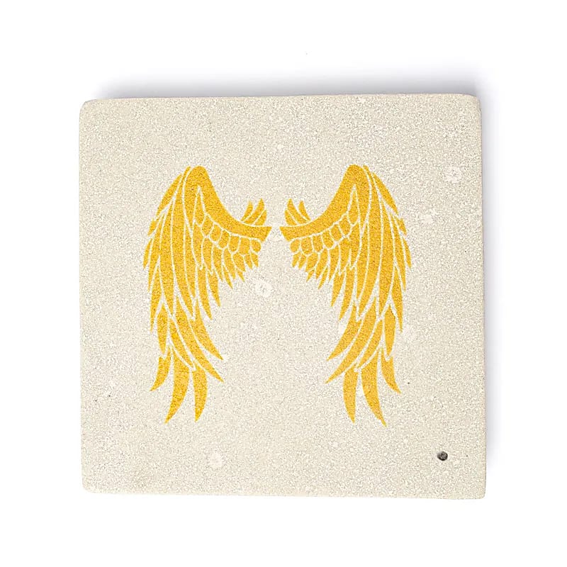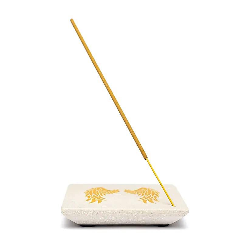 Ein moderner Räucherstäbchenhalter aus Sandstein, versehen mit einer goldfarbenen Darstellung von Engelsflügeln.