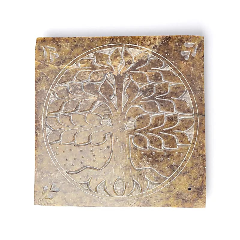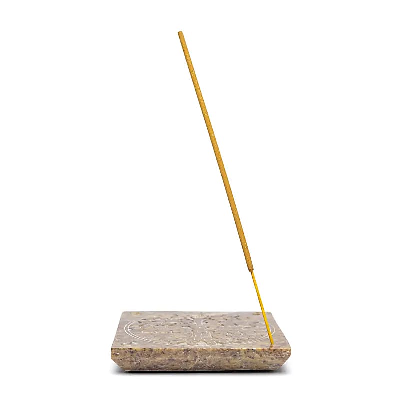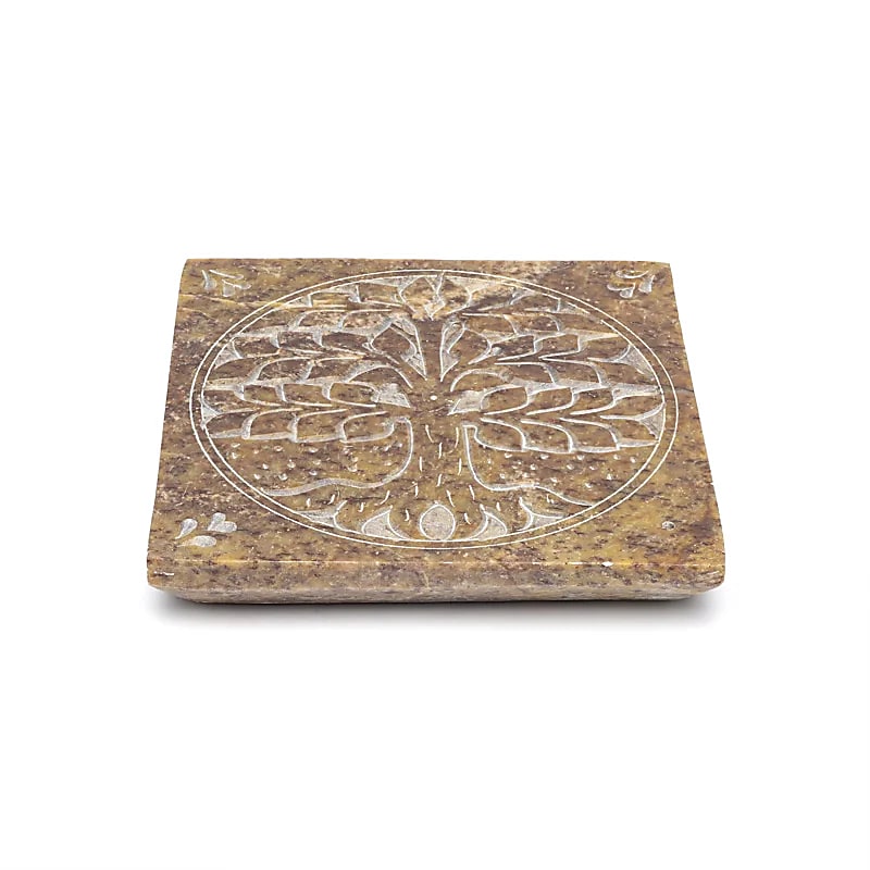Quadratischer Räucherstäbchenhalter aus natürlichem Speckstein mit eingraviertem Lebensbaum-Motiv.