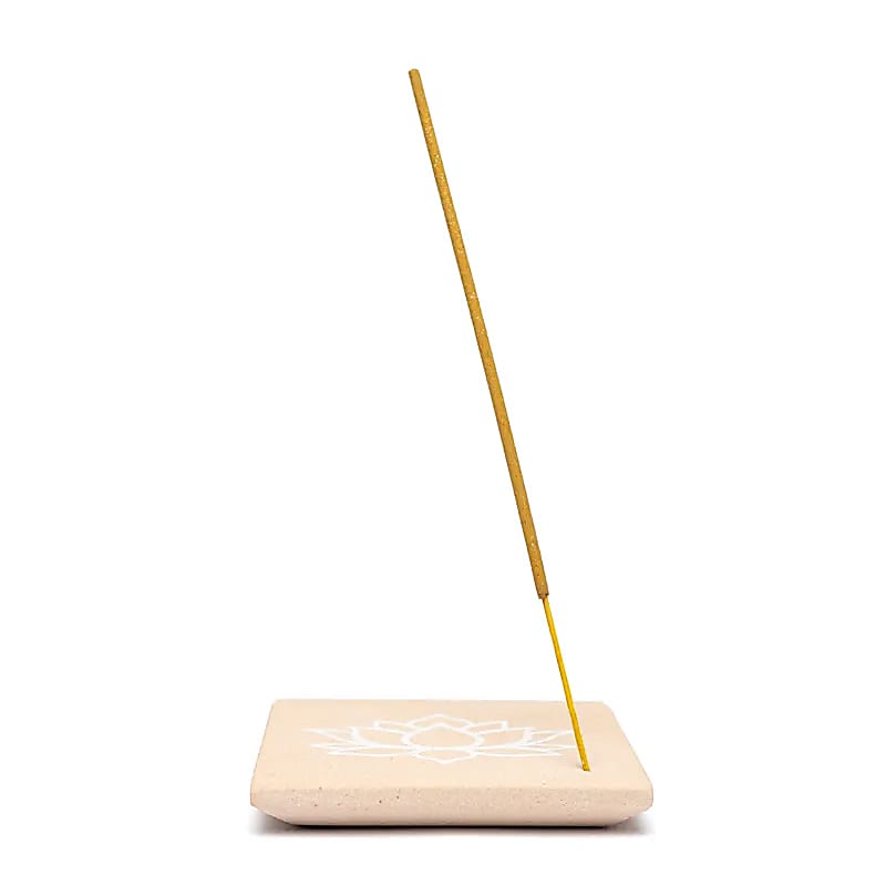 Ein moderner Räucherstäbchenhalter aus rosafarbenem Sandstein mit einem weißen Lotusmotiv.