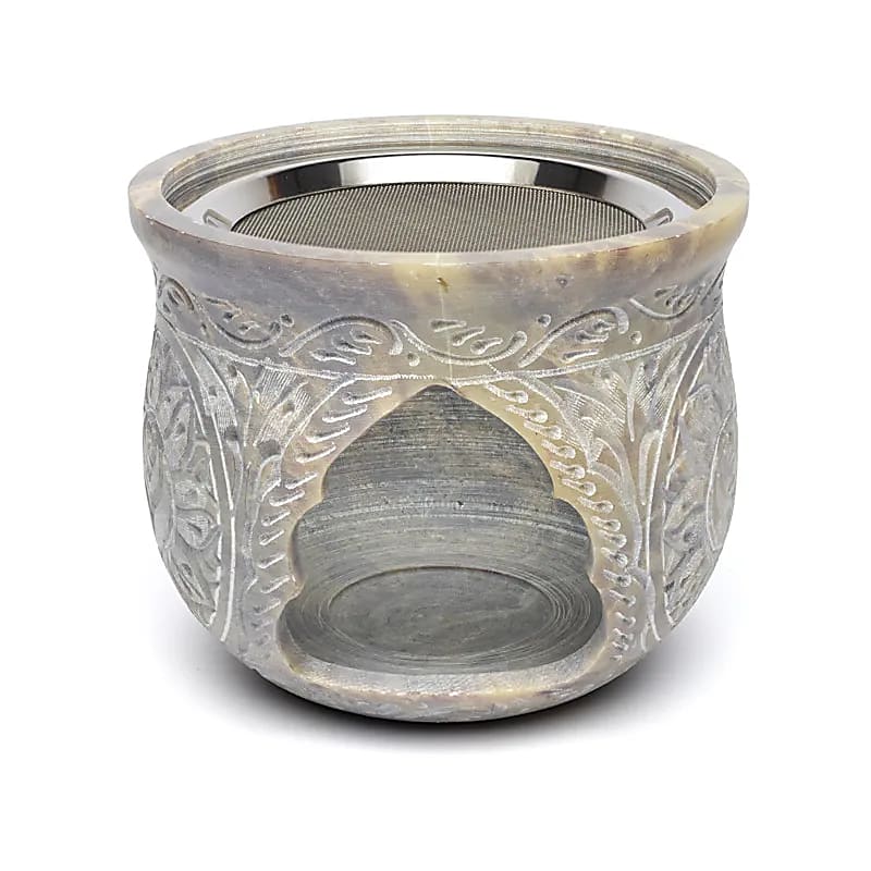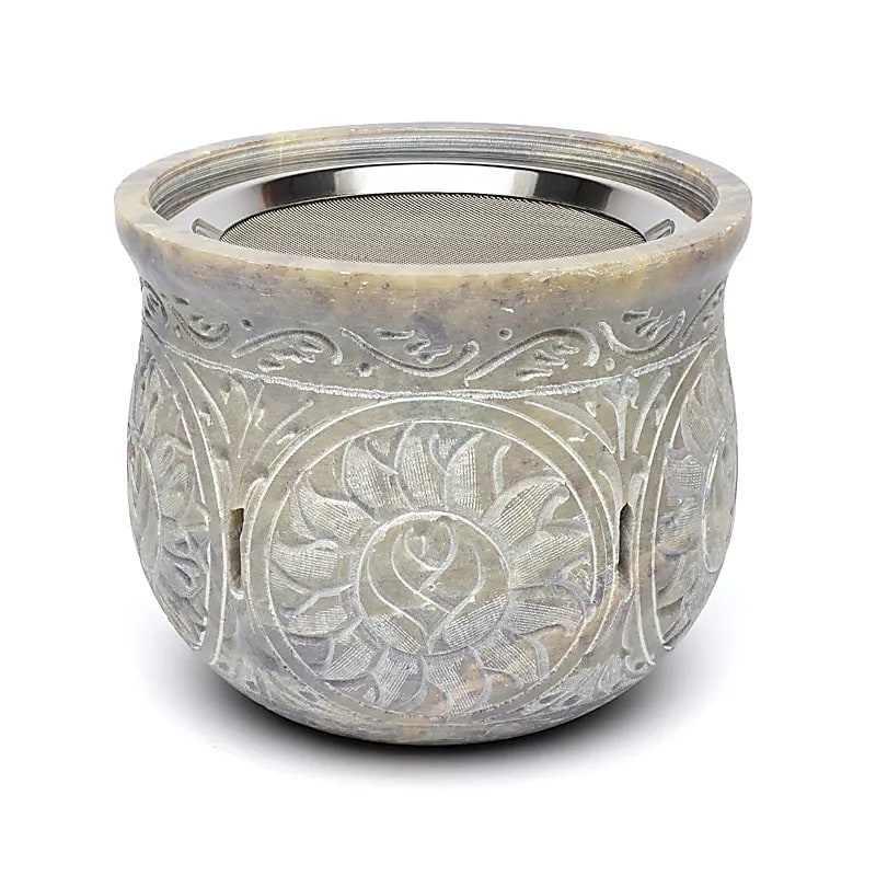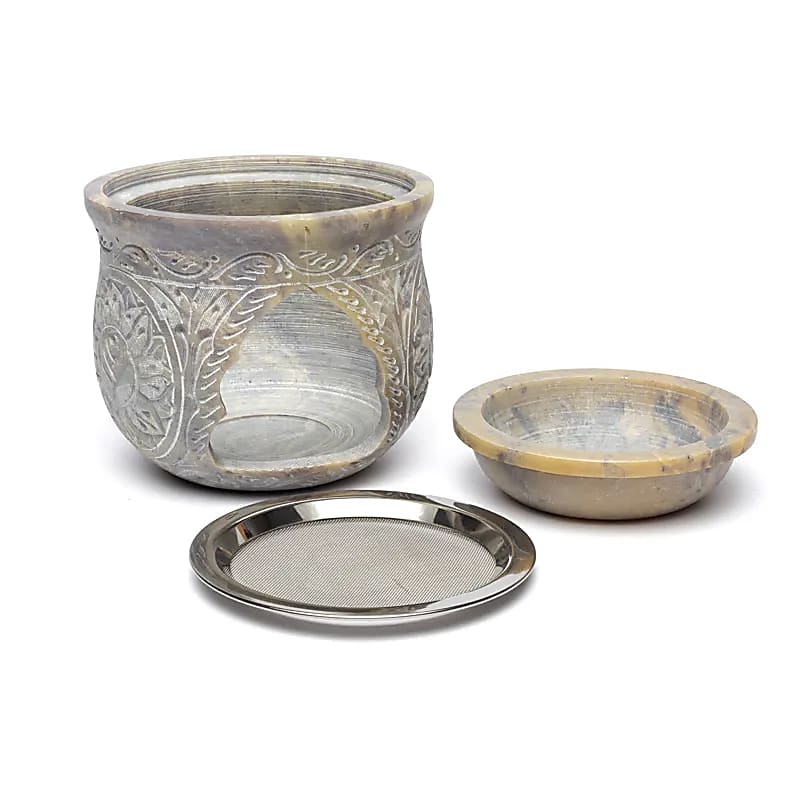 Große Duftlampe aus Speckstein, schwere Qualität. Speckstein ist ein Naturprodukt, weswegen die Farbe dieses Artikels manchmal heller oder dunkler, mehr oder weniger marmoriert ausfallen kann. Diese Duftlampe wird mit Sieb und Schale geliefert, wodurch sie Räuchergefäß und Duftlampe in einem ist.